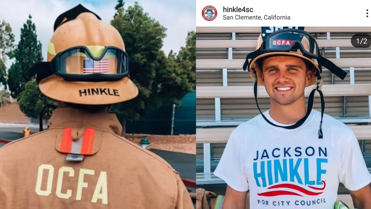 That would be the Orange County Fire Authority gear he has on.... ostensibly the OCFA's political PAC supported him with $7000 in donations, but you are NOT supposed to use public gear to support or endorse campaigns