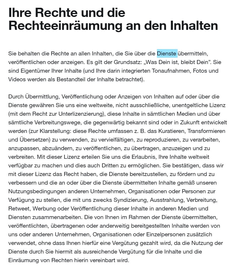 Eine fundamentale Umstellung des Dienst-Angebotes, wie im Zusammenhang mit #Xitter kann dazu führen, dass X Corp nicht mehr berechtigt ist, zuvor von Twitter-Nutzern bereitgestellte Inhalte zu nutzen. Die Zulässigkeit hängt davon ab, ob der Dienst in einer... 1/