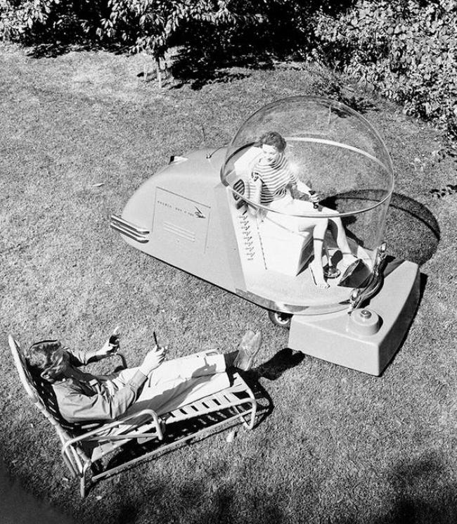 En realidad este increíble invento es una podadora del año 1957. Tiene una cabina de plástico de un diámetro de 1,5 metros, un radioteléfono y un aire acondicionado. Este invento podía cortar el pasto, recoger la nieve y usarse como carrito de golf.