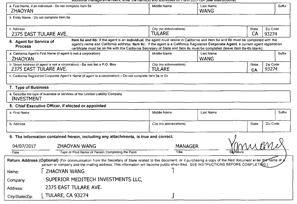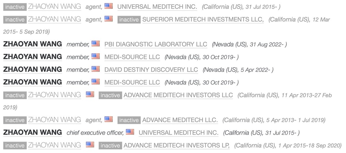 8- In addition to UMI & PBI, Wang Zhaoyan is also listed as CEO, agent, or managing member of at least 5 companies in Nevada & California: Superior Meditech Investments LLC, Medi-Source LLC, David Destiny Discovery LLC, Advance Meditech LLC, & Advance Meditech Investors LLC