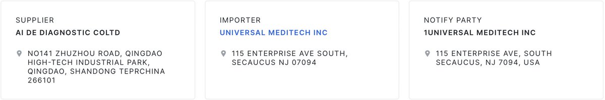 6- In addition to the shipments to Nevada and California, Ai De Diagnostic apparently shipped to UMI at 115 Enterprise Ave. South Secaucus, NJ 07094 in June 2019 7- Ai De Diagnostic is apparently affiliated with International Newtech Development Inc., active in west Canada
