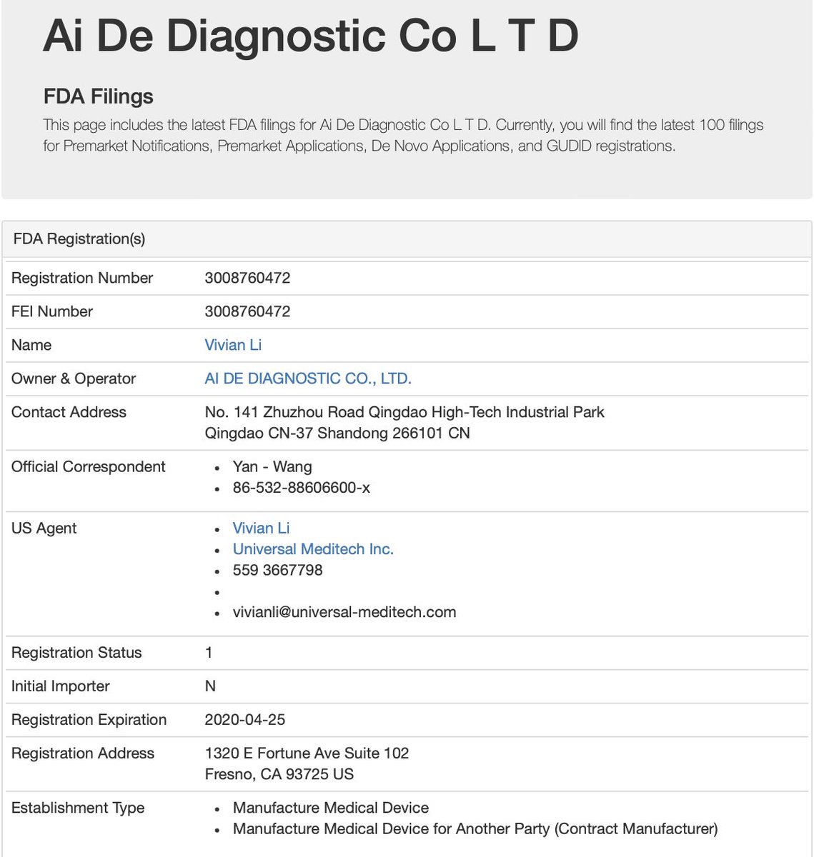 5- FDA filings also list Ai De Diagnostic at “87 Zhuzhu Road” in Qingdao, which closely resembles the address given for Yao Xiuqin, “87 Zhuzhou” Road in Qingdao