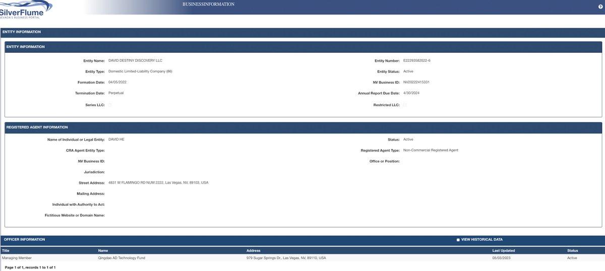 22- The address 4831 W FLAMINGO RD #2222, Las Vegas, NV, 89103, has been listed for Yao Xiuqin, Wang Zhaoyan and David Destiny Discovery in some business filings