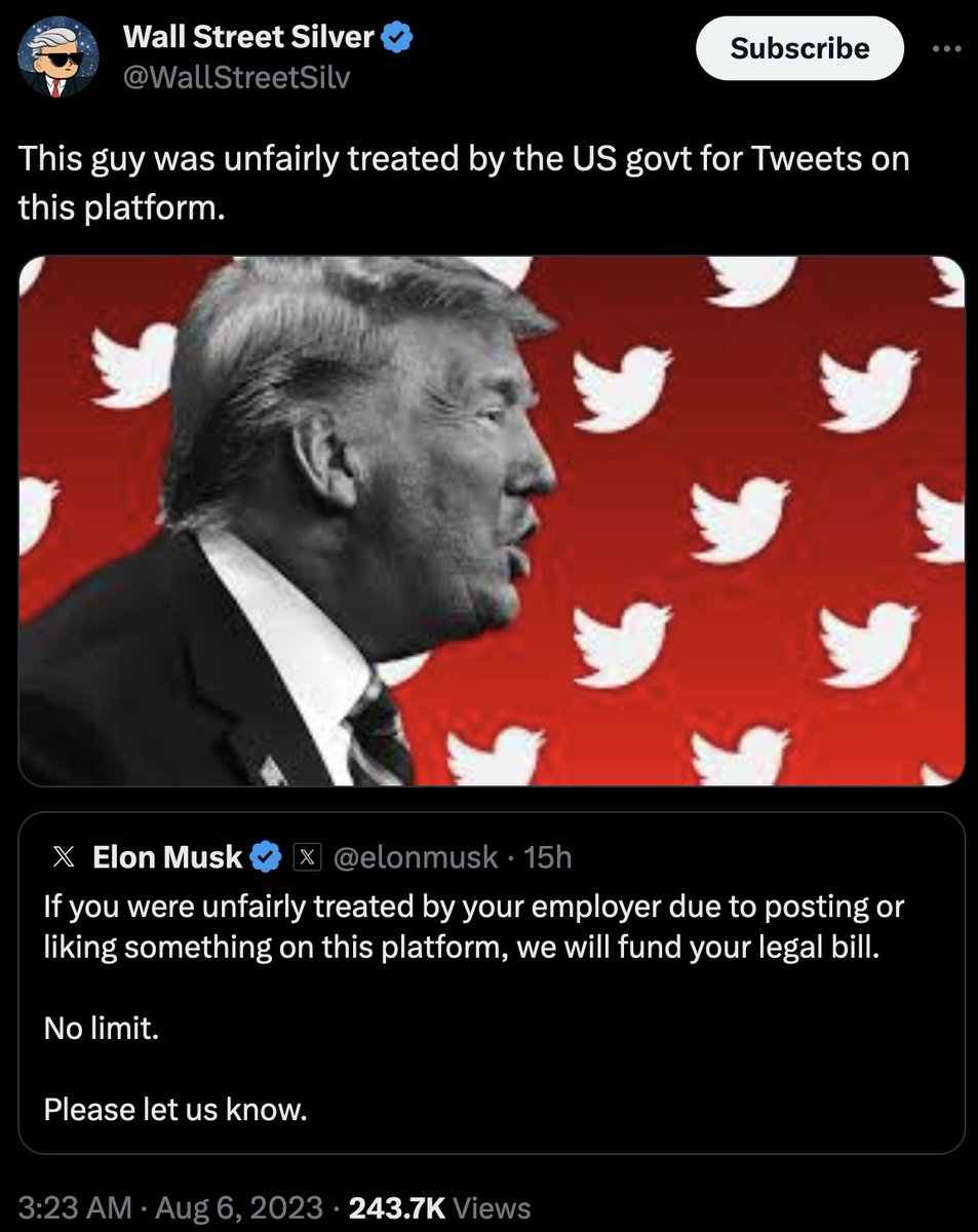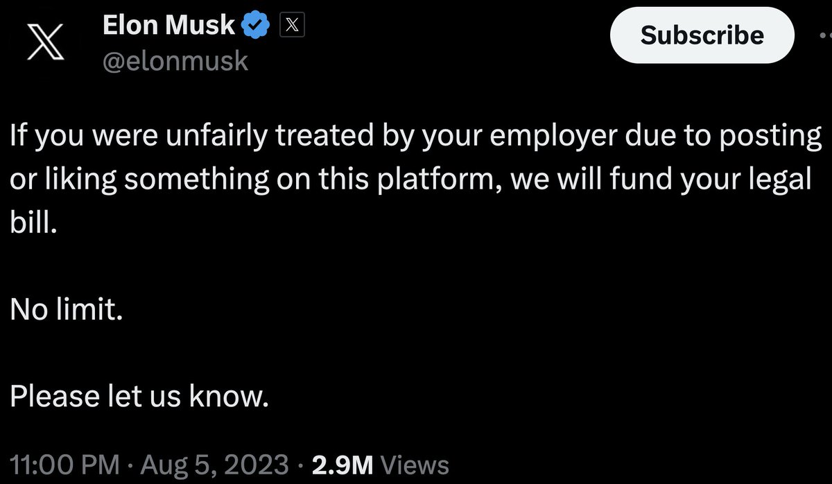 "If you were unfairly treated by your employer due to posting or liking something on this platform, we will fund your legal bill."