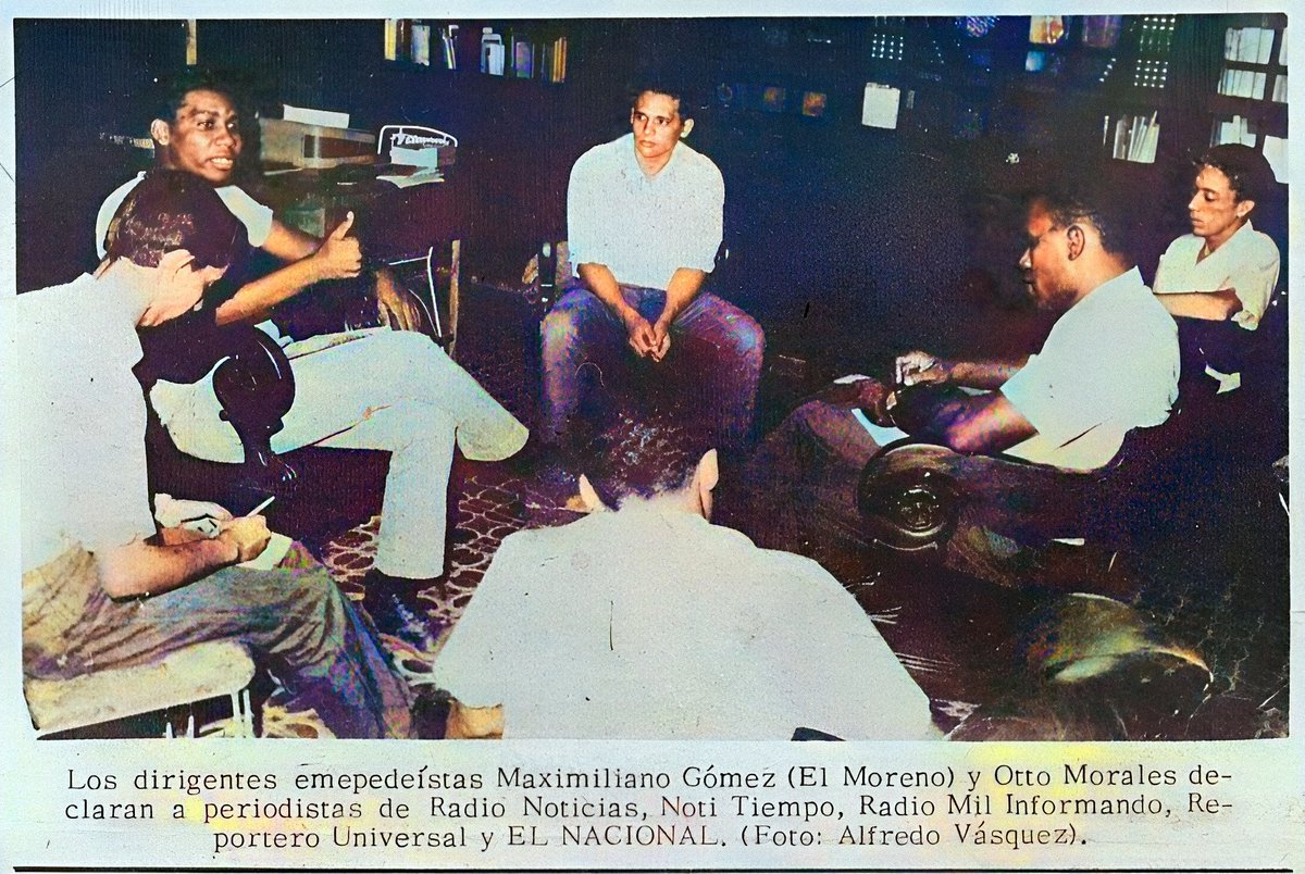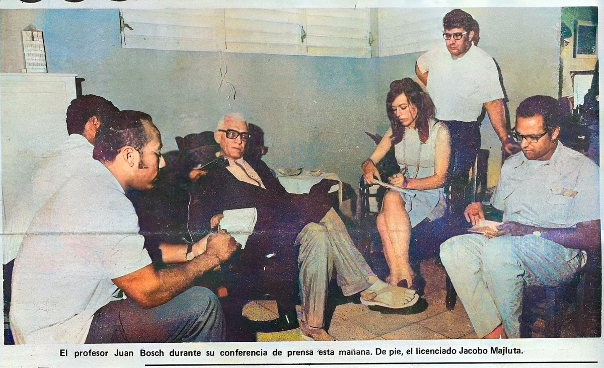 7. A la izquierda, tomando notas, Huchi Lora. A su lado, gesticulando, Maximiliano Gómez (padre de Guido Gómez Mazara) líder del MPD. En el centro Otto Morales en una rueda de prensa en 1968.
