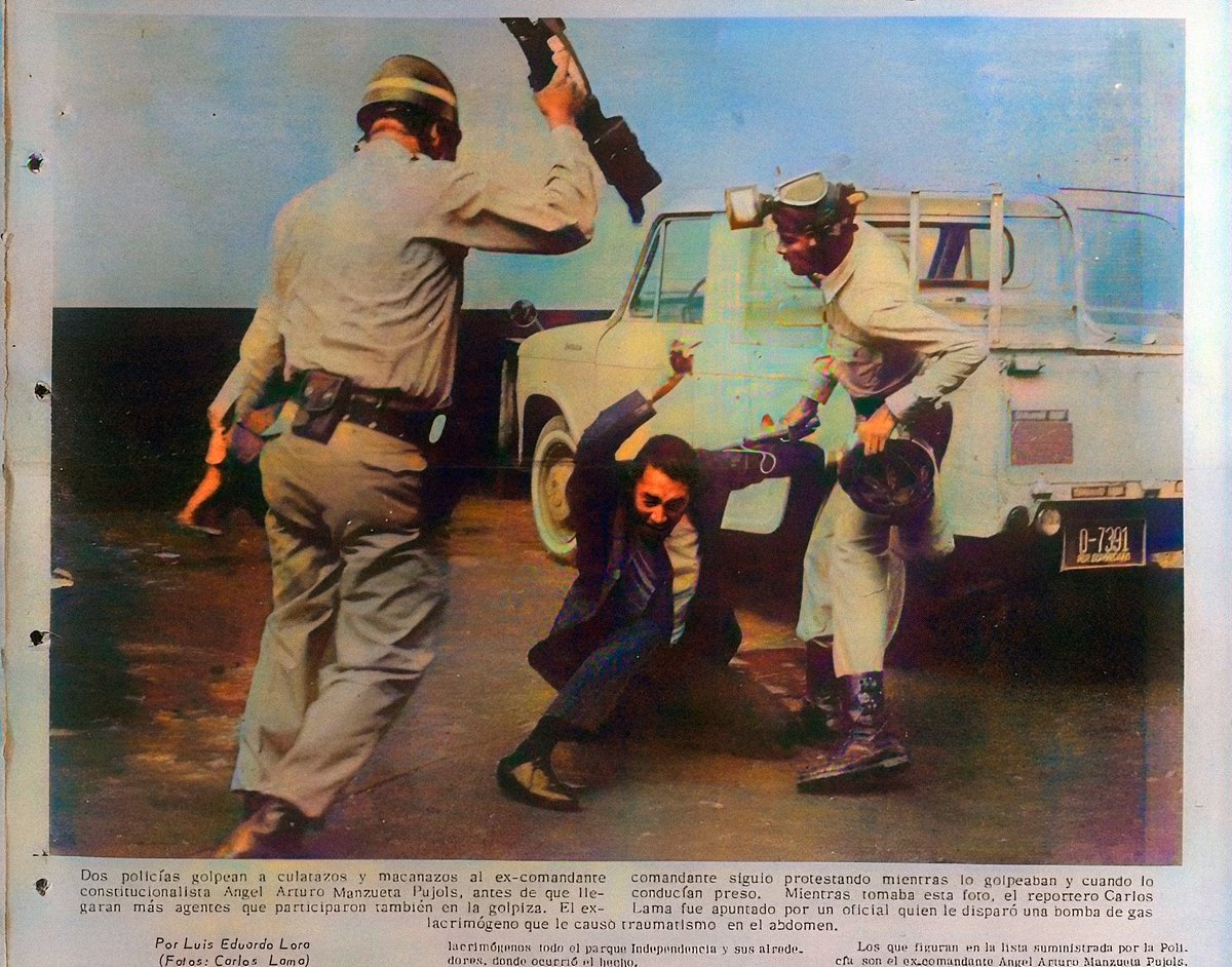 23. Dos policías golpean al excomandante constitucionalista Ángel Arturo Manzueta cuando la PN dispersó a tiros y bombas una marcha pacífica por el tercer aniversario de la guerra de abril.