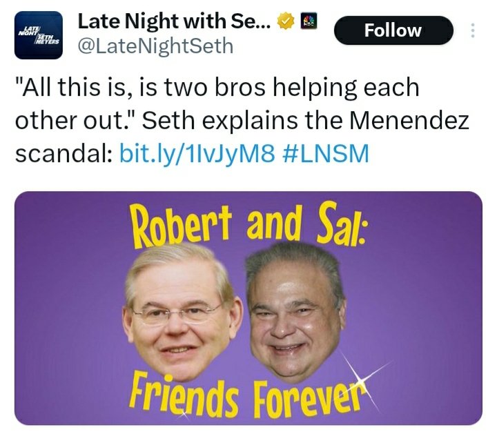 Seth Meyers used the Menendez brothers as a punchline many times on his show. He commented that even after a bribery conviction, Senator Bob Menendez would still rank as "the third worst Menendez". https://t.co/qtnKL4PzzMtwitter.com/i/web/status/1…