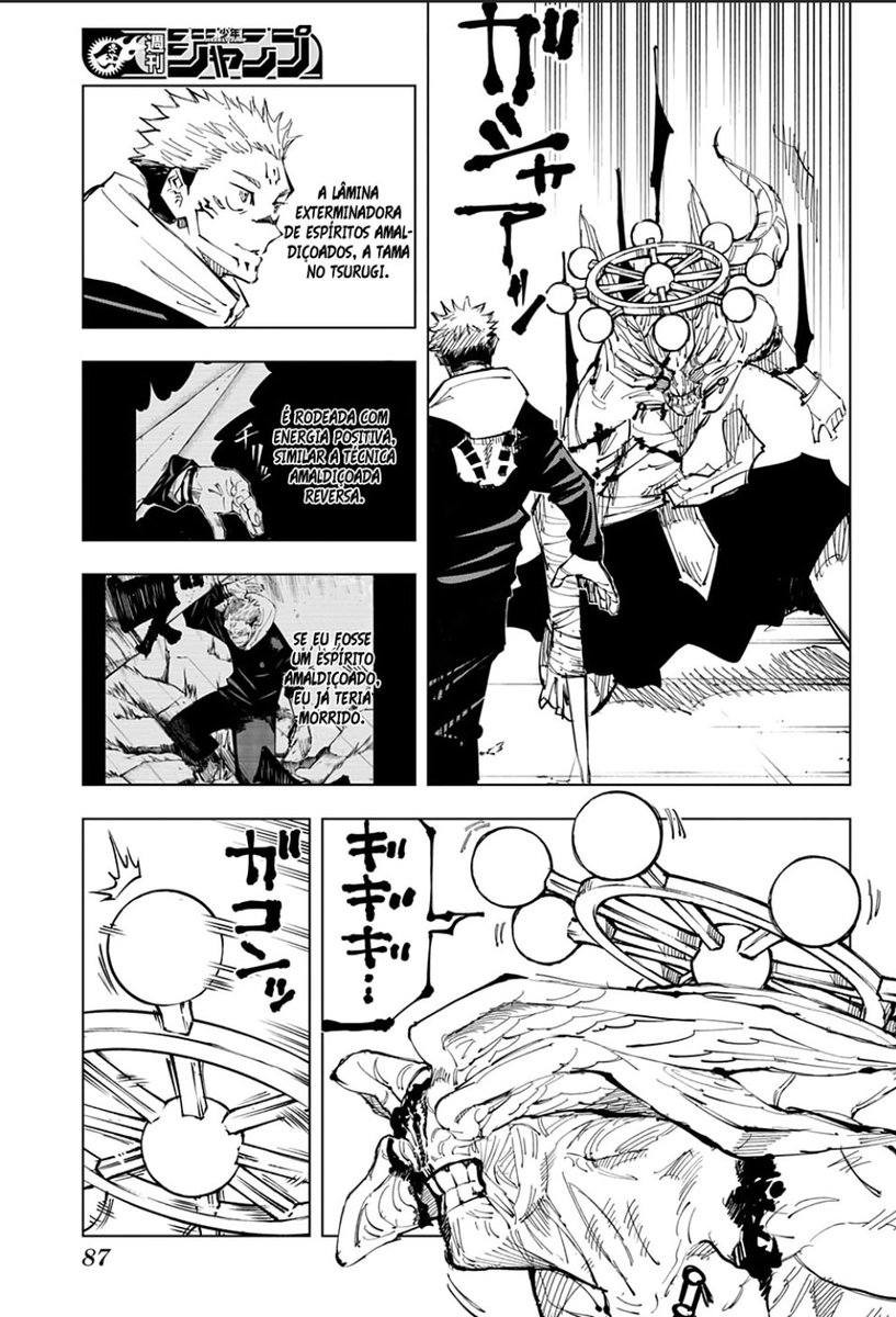 Ele também nota que a lâmina do mahoraga é coberta por energia positiva, o que é muito eficaz contra maldições