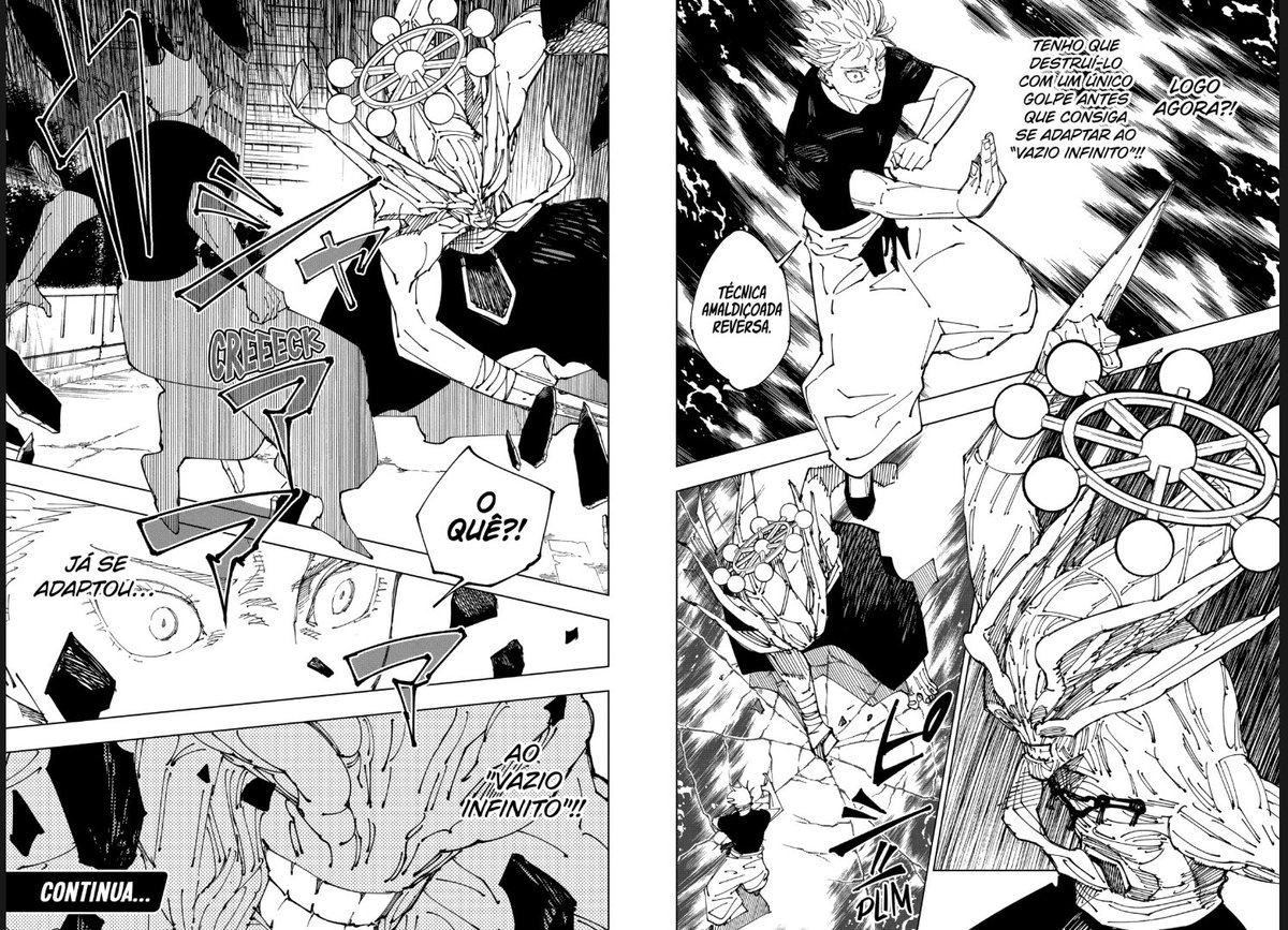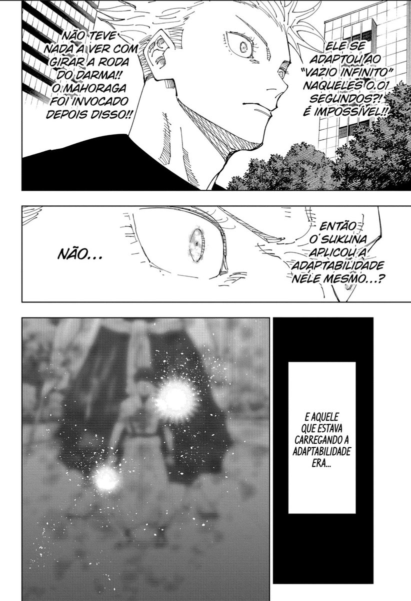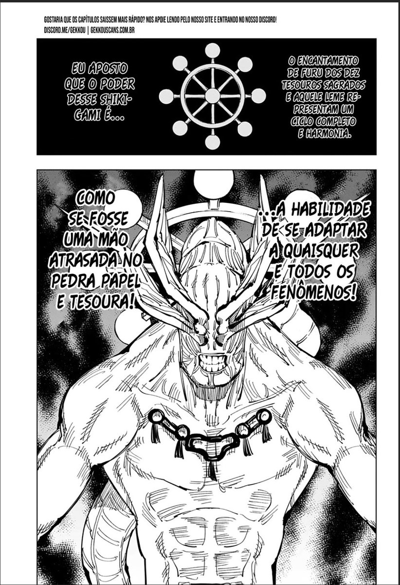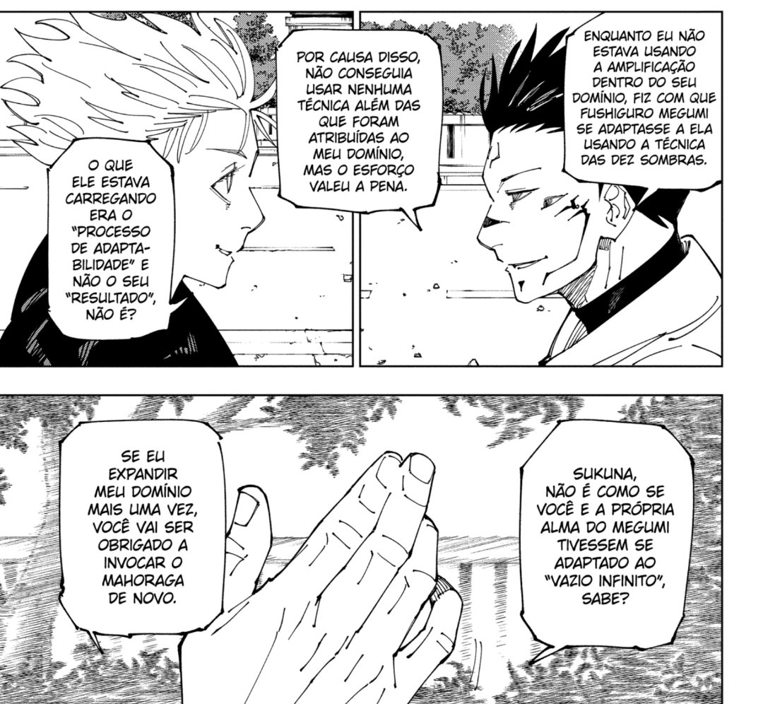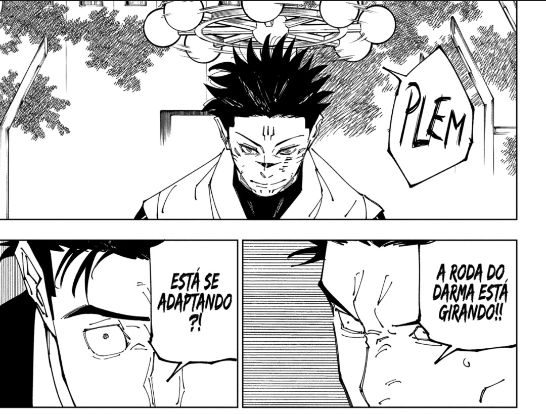 Mas o importante é que o Sukuna deixa claro qual é o plano dele: ele agora vai usar a roda do Mahoraga para passar pelo processo de adaptação do mugen
