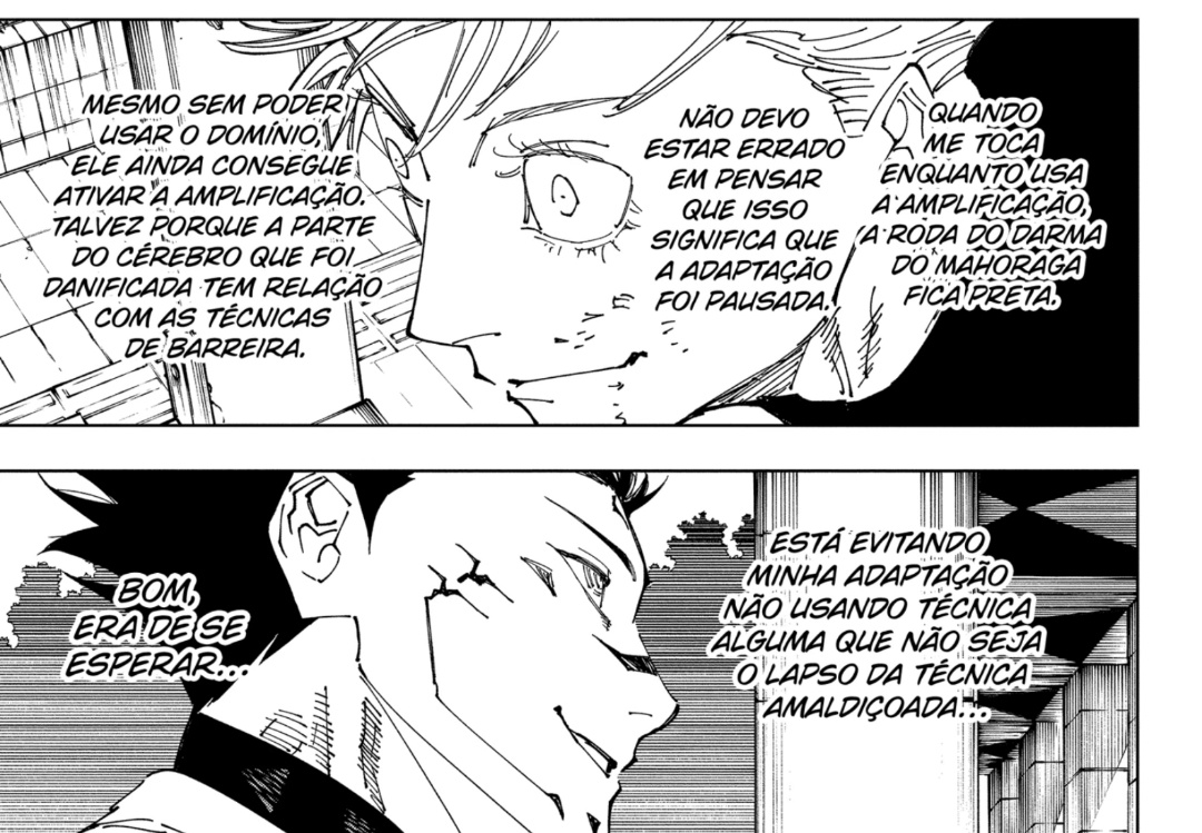 Um detalhe é que o Sukuna não pode usar a amplificação de domínio junto do Mahoraga, o que interrompe o processo de adaptação