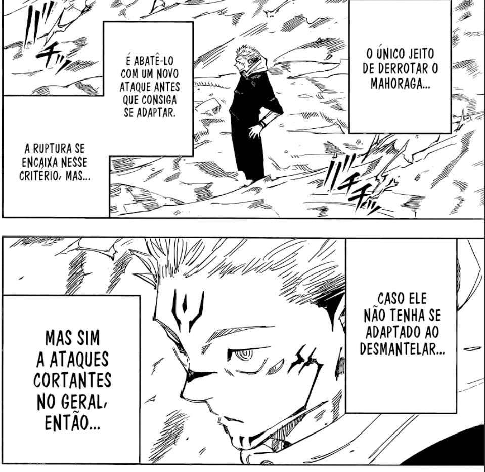 Então o Sukuna chega à conclusão de que o Mahoraga reconhece os ataques e se adapta aos feitiços, como uma mão atrasada no pedra, papel e tesoura