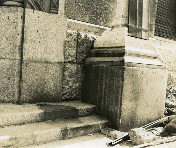 É o caso da pessoa de bengala que foi surpreendida pela explosão enquanto subia os degraus na fachada do Banco Sumitomo, no centro de Hiroshima.