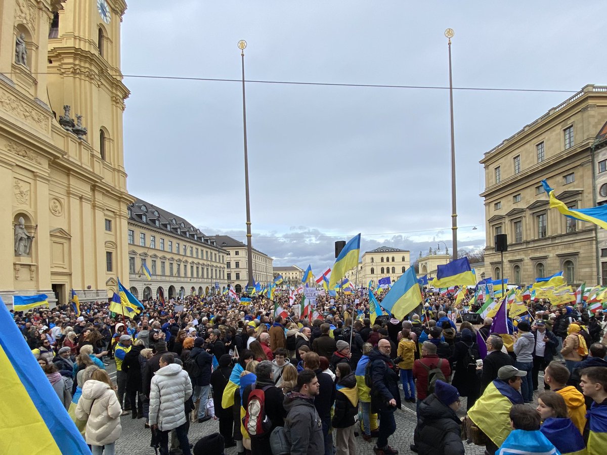 Beginnen wir mit der Ukrainisch-Deutschen Kundgebung am Odeonsplatz: @derspiegel schreibt "Der »Süddeutschen Zeitung« zufolge wehten dort hauptsächlich blau-gelbe Ukraine-Flaggen. Die Menschen forderten demnach auf Ukrainisch, Englisch und Deutsch Unterstützung für ihr von 2/17