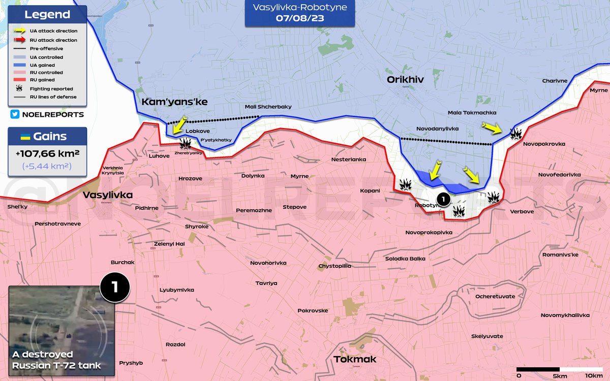 In the center of Robotyne an approaching T-72 tank was destroyed. It does indicate that Russia can have presence inside the town, but doesn't dominate it anymore. The town is likely now a gray zone.