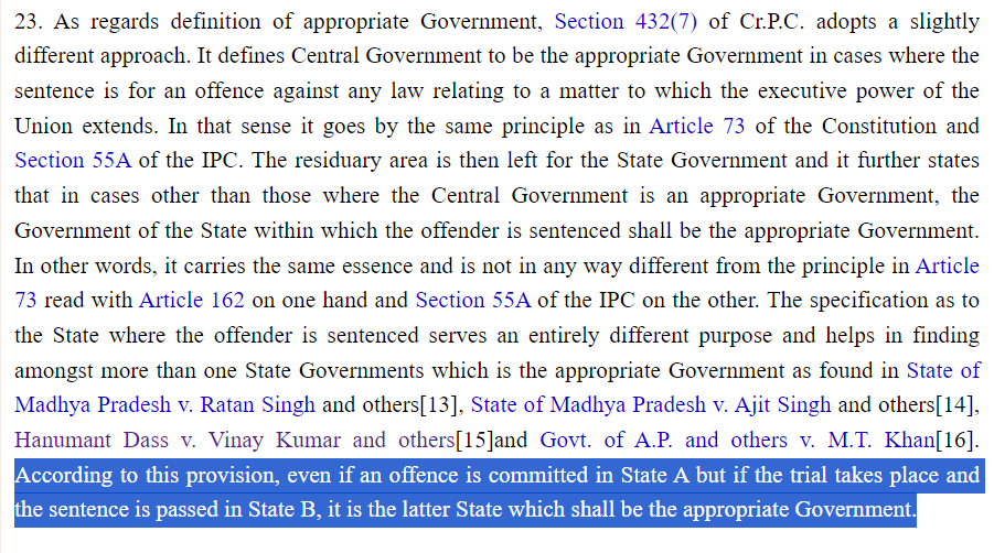 Gupta: 'Appropriate government' for grant of remission would be Maharashtra, not Gujarat...The unambiguous language of Section 432(7)(b) of CrPC, 1973 makes it clear. (Relies on 1976 judgment of #SupremeCourt in Ratan Singh)