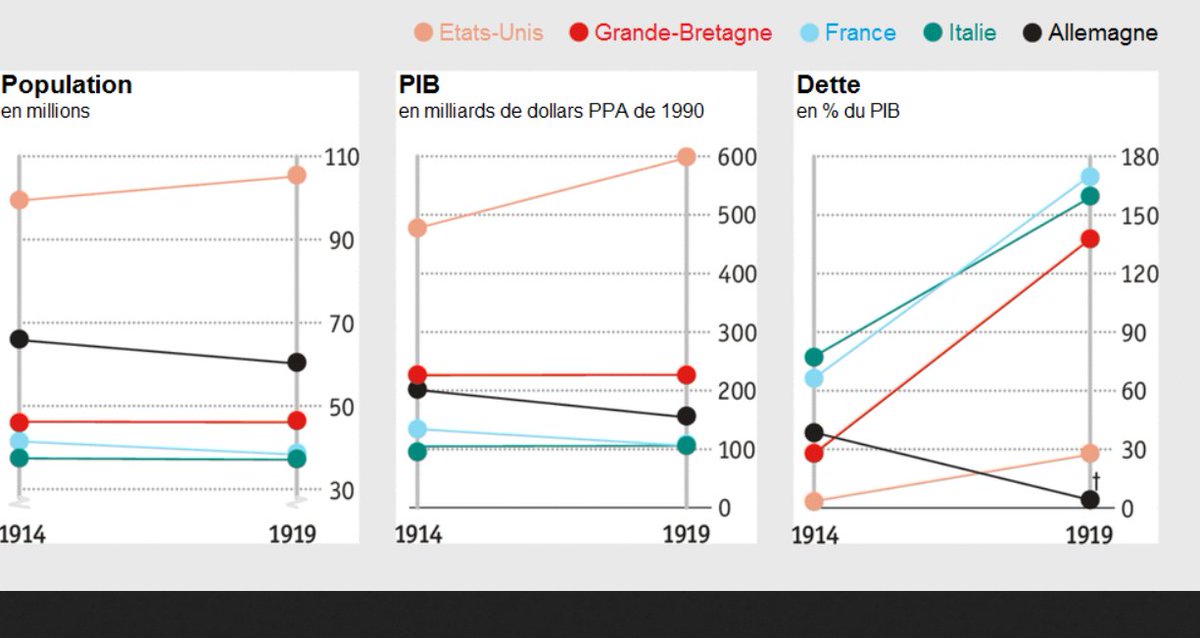 Le prix est lourd. 1.4 millions de morts, 4 millions de blessés. Chaque famille touchée, 10% d’orphelins. 25% du pays ravagé, dont certains départements à 90% comme l’Aisne. Debitrice de 45 Mds de francs en 1913, créditrice 33 mds en 1919.