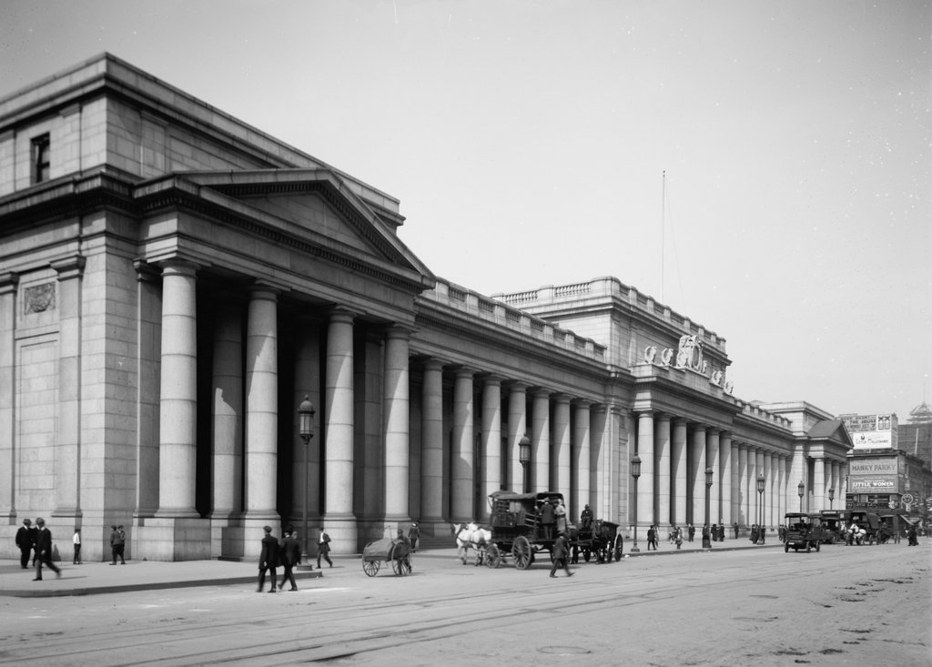 4) The main facade of the station stretched 132 metres along 7th Avenue, comprising a magnificent Doric colonnade of 30 columns which drew influence from landmarks such as the Propylaea gateway to the Athenian Acropolis and Bernini's Doric piazza of St Peter's Square in Rome.