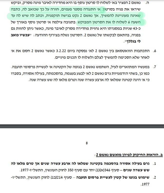 כתב אישום גם נגד רז אילוז בן ה-26 מאור עקיבא! בגין בהפצת סרטונים מיניים של בנות 17 ו-20. הן שלחו לו בצפייה חד פעמית, הוא הקליט מסך ורץ להפיץ עם שמותיהן. כל כך מיהר שגם שמו נשאר בתיעוד.