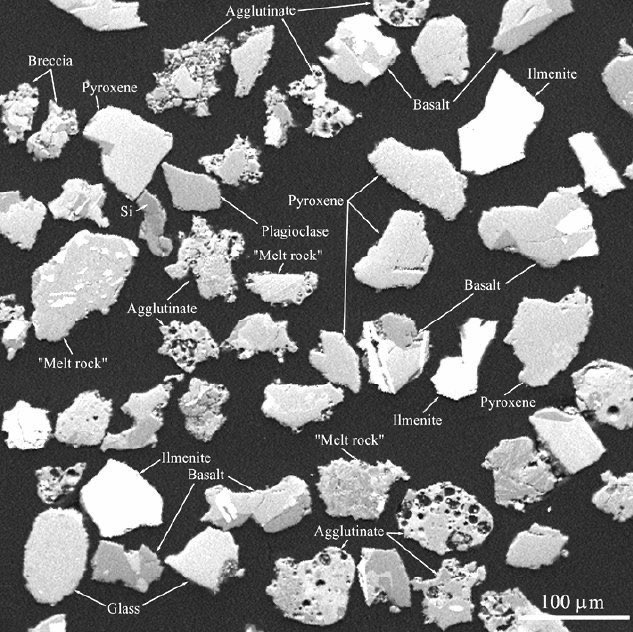 3/ We attributed this (at the time) to differences in the particle shapes. We hypothesized that lunar simulant JSC-1A has more rounded shapes because it was created through ball milling lava, whereas BP-1 (for example) was made by blasting lava. (Image: real lunar soil)