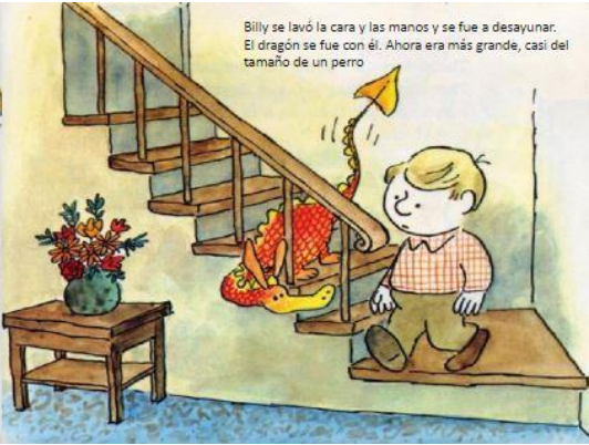 Billy bajó a desayunar, y el dragón se fue con él. Billy intentaba ignorarlo (total, no existía!), pero no pudo evitar darse cuenta de que el dragón había crecido, y ahora tenía el tamaño de un perro.