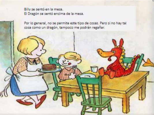 Billy se sentó a la mesa, y el dragón se sentó encima de la mesa. Normalmente no se lo permitirían, pero como el dragón no existe, tampoco le dijeron nada.