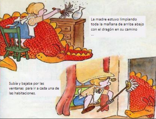 La madre estuvo limpiando toda la mañana, pero como el dragón ocupaba ya todo el pasillo, tenía que entrar y salir por las ventanas para llegar a todas las habitaciones.
