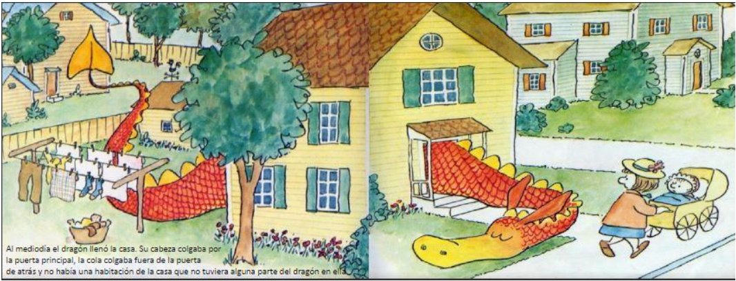 Al mediodía, el dragón era tan grande que llenaba la casa. Su cabeza salía por la puerta principal, su cola salía por la puerta trasera, y no había una habitación que no tuviera una parte del dragón en ella.
