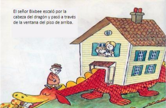 Cuando llegó el señor Bixbee, se encontró con que el dragón se había llevado al casa a dos manzanas de distancia y estaba devorando el pan de una panadería cercana.