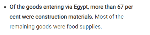 Because the border with Egypt is not controlled by Israel. About 21K truckloads of goods entered Gaza via Egypt. And what is the majority of this Egyptian sourced stuff? You got it, construction material, likely the items Israel limits. Here is info from the UN website: 7/