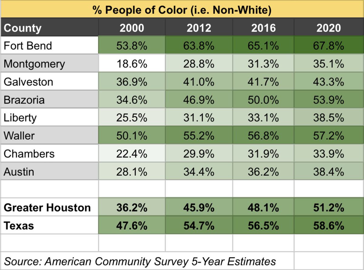 Fort Bend County, the most populous and fastest growing in the region, has the highest share of people or color (68%, up from 54% in 2000).