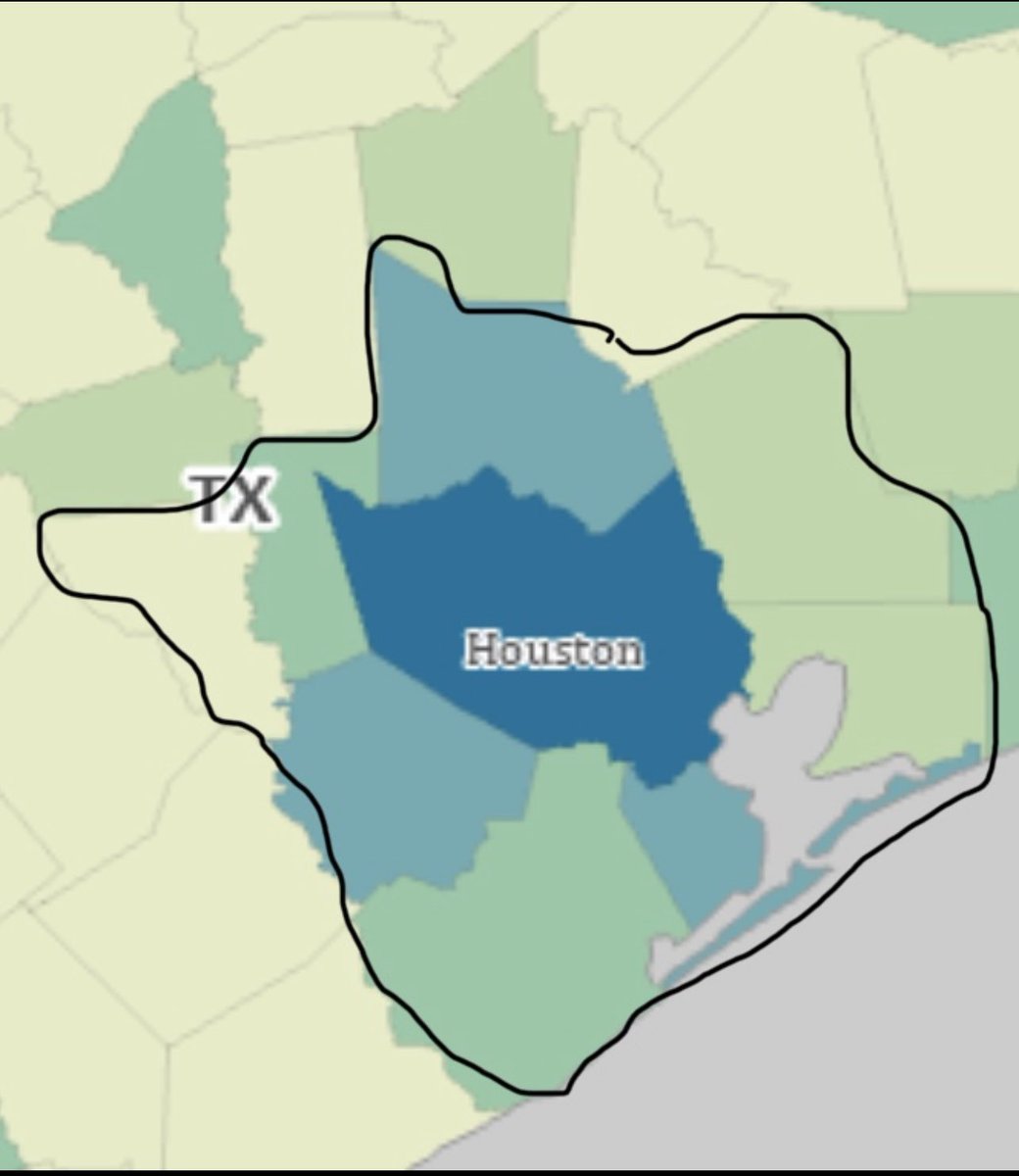 Greater Houston (the Houston-The Woodlands-Sugar Land metropolitan area excluding Harris County) is comprised of 8 largely suburban counties surrounding Harris County.