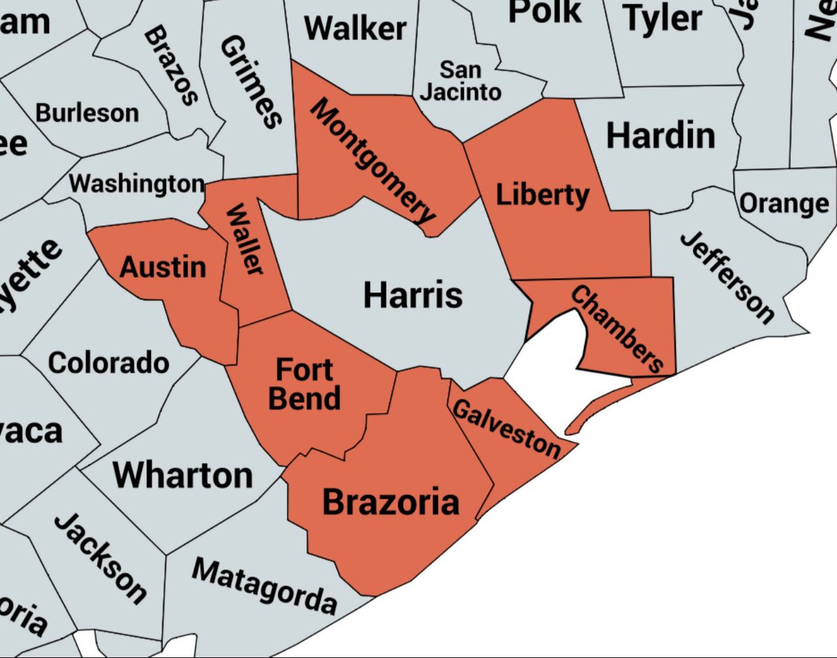 ~15% in Galveston County (League City/Texas City/Galveston) to the SE