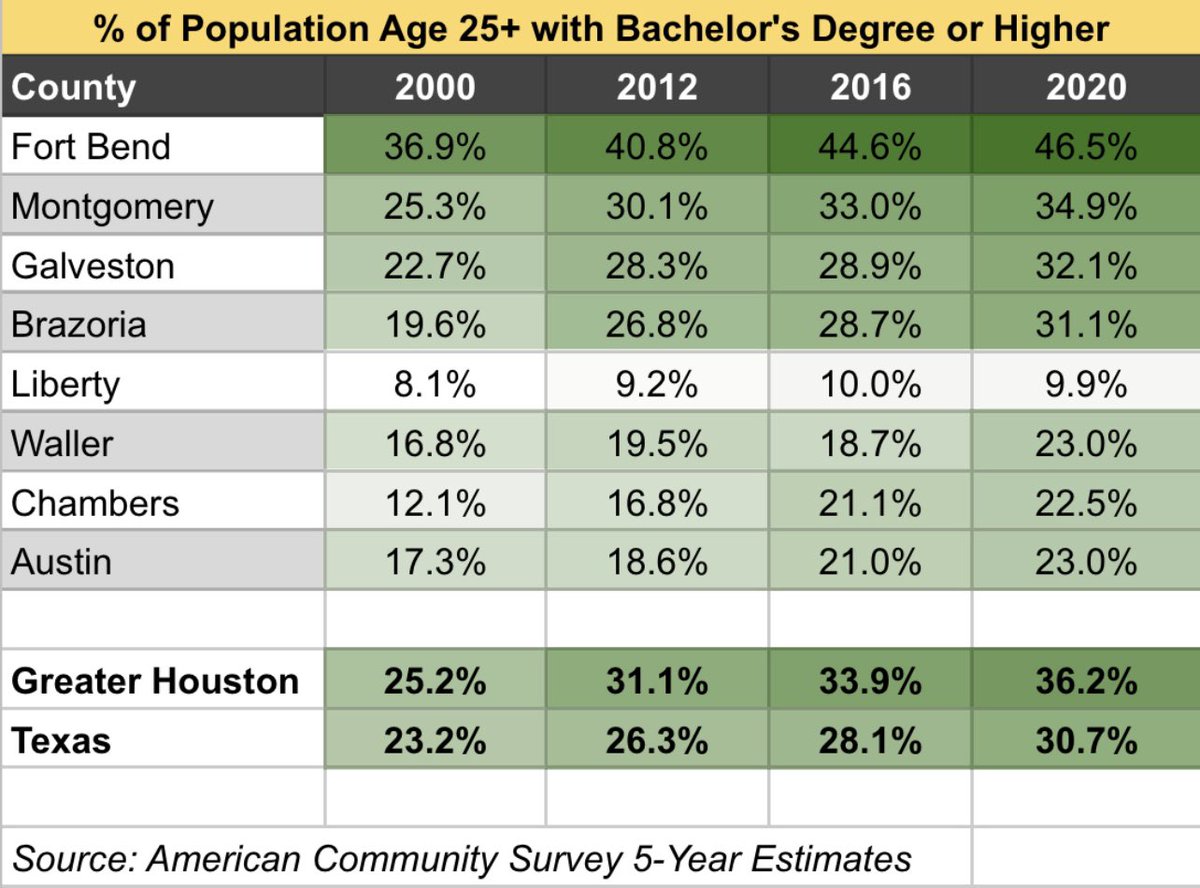Fort Bend County (47%) has the highest share of college grads in the region, then Montgomery (35%), Galveston (32%) & Brazoria (31%)