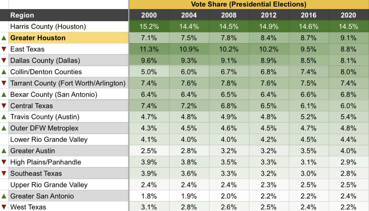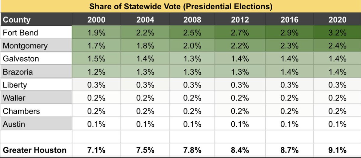Now the second most populous region in the state, Greater Houston’s share of the statewide vote has risen in each pres. election since 2000 (from 7.1% in 2000 to 9.1% in 2020)