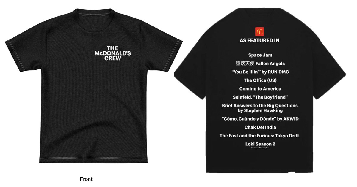 7/10 The campaign is also going to take over our US restaurants in a cool way, with iconic posters. One of my fav things is the crew t-shirt, making our crewmembers the stars of the show, following the same construct : “the McDonald’s crew” as featured in + IPs. Including Loki.