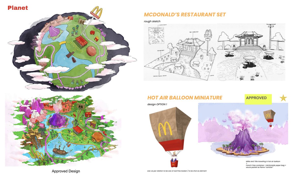 Then, it was time to start defining the visual identity of the world that would best suit McDonaldland. We worked with our archivist and all available material to stay as true as possible to the original iteration. You can see some examples of the initial mock-up and early drawings of the universe the teams wanted to build and the level of care and detail that went into it.
