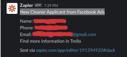 Facebook wants you to collect customer data on their platform, so we just set up a Zap that tells us when a customer applies via Facebook.