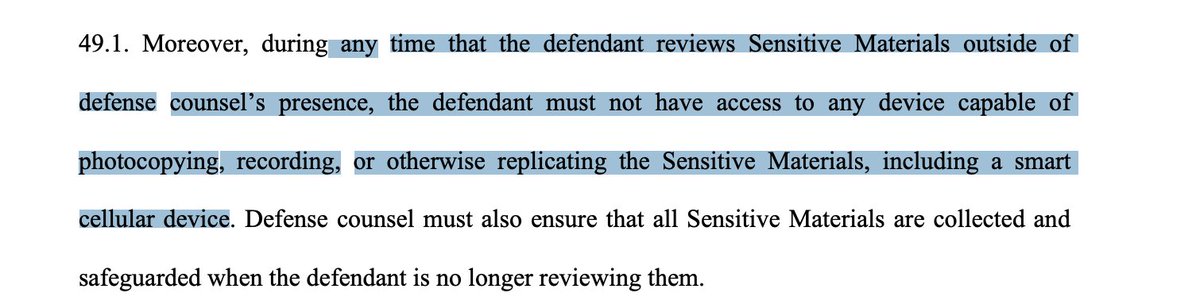 Here is the language barring Trump from having a phone or other electronics while reviewing sensitive discovery. https://t.co/6rIyhnZNf7storage.courtlistener.com/recap/gov.usco…