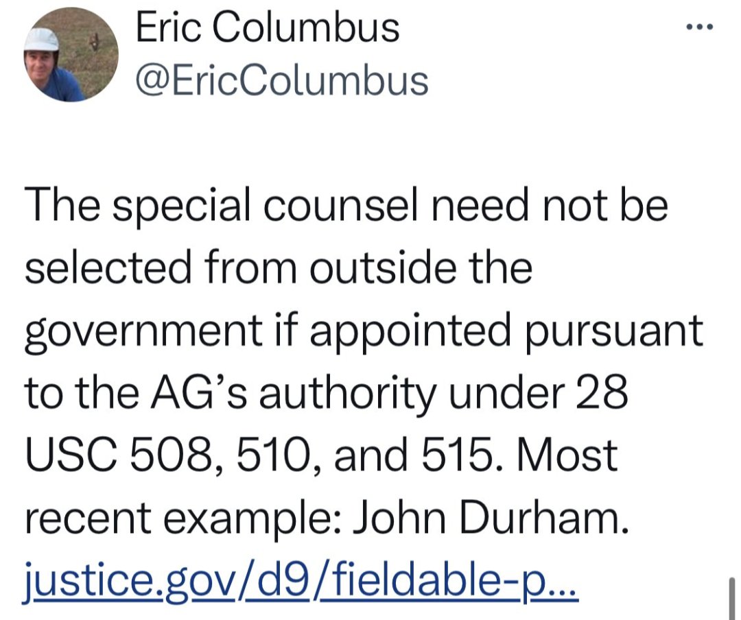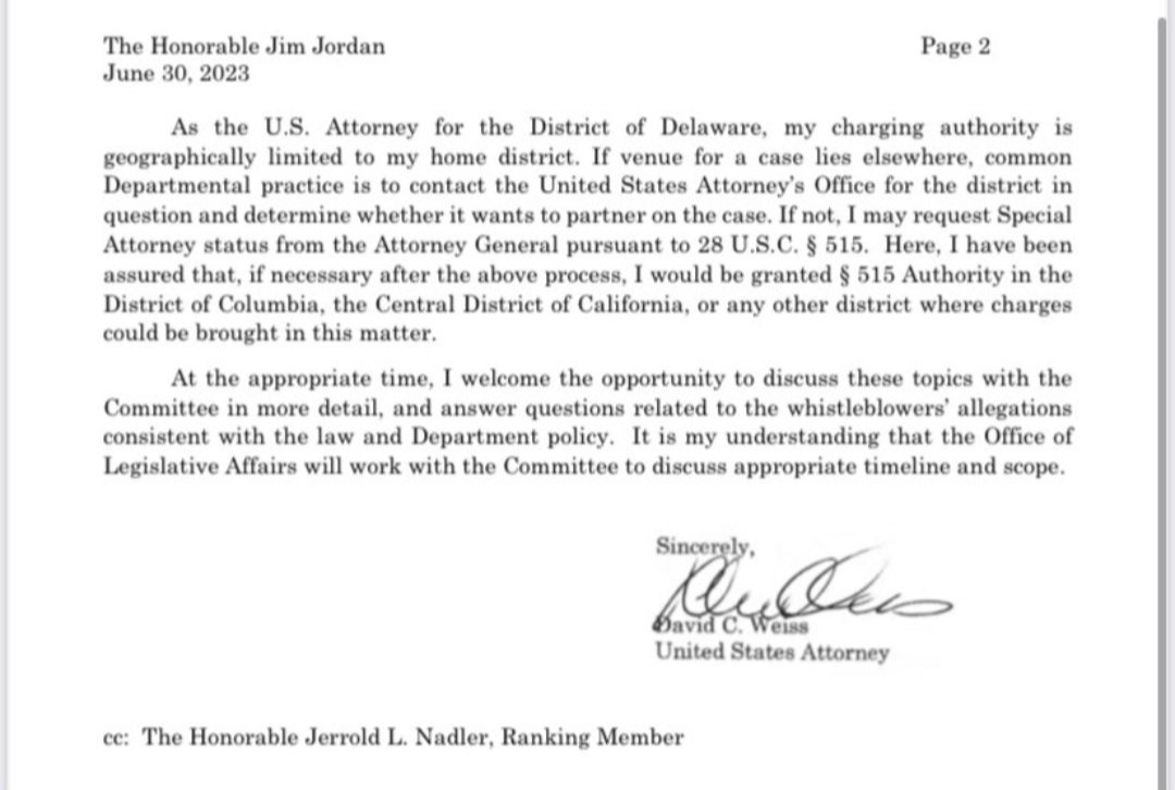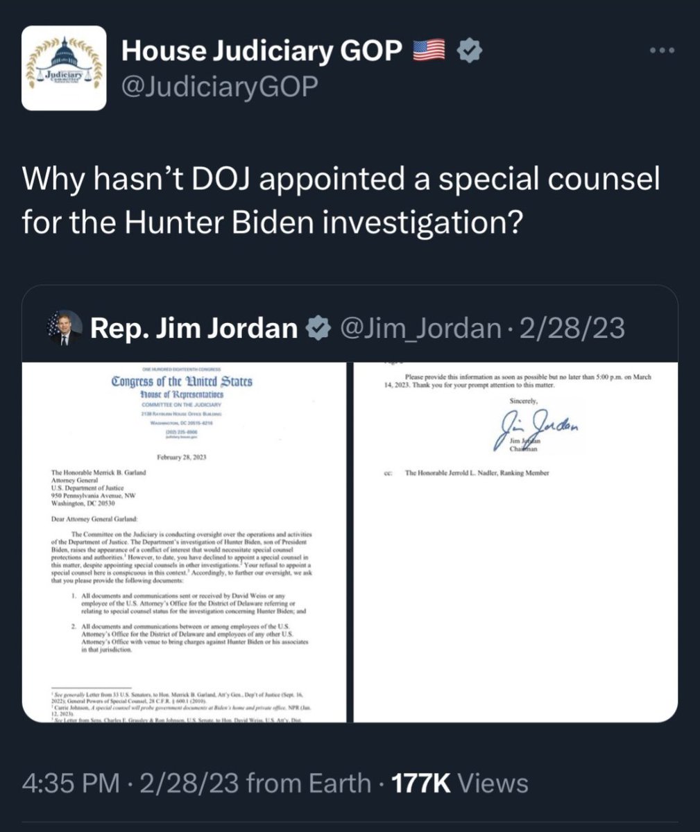 🚨 Here is more evidence Representative Jim Jordan wanted US Attorney Weiss appointed as special counsel as early as September 2022 and this tweet as of February 2023.