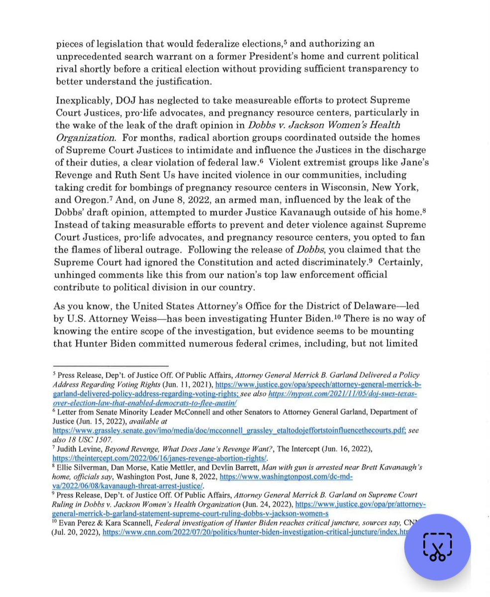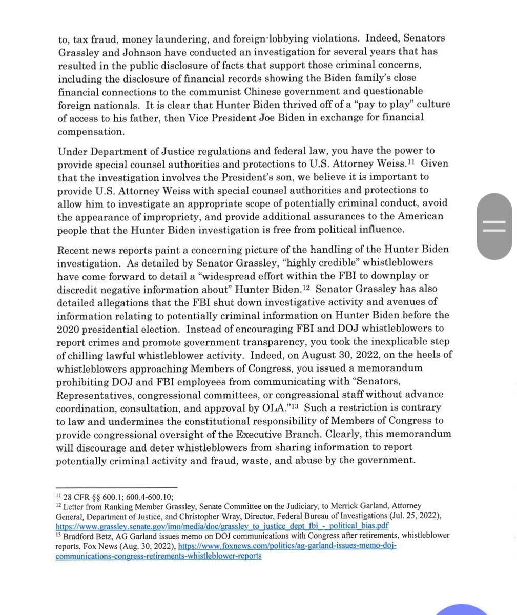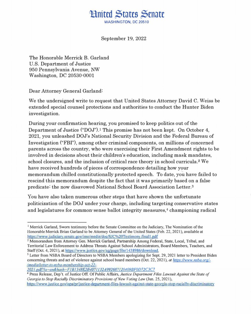 Letter sent to Attorney General Garland September 2022. Notice the repeated requests to name US Attorney David Weiss Special Counsel.