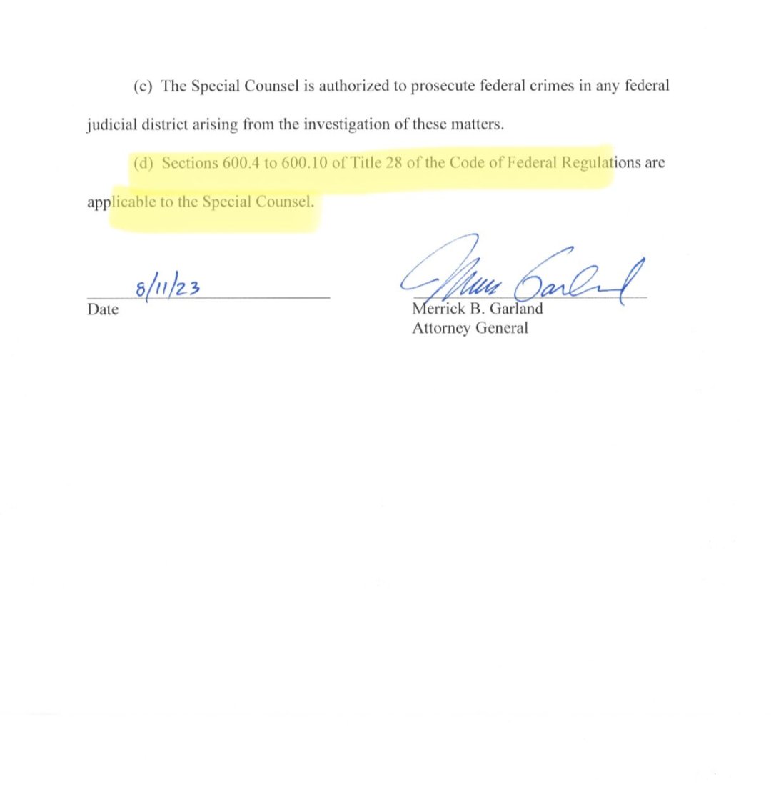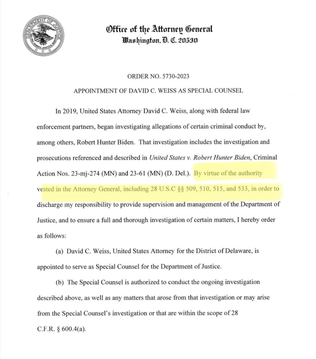 Here is the filing under which Attorney General Garland appointed US attorney Weiss to Special Counsel.