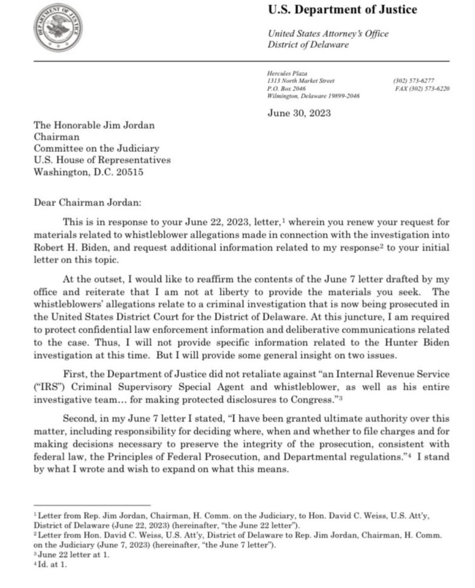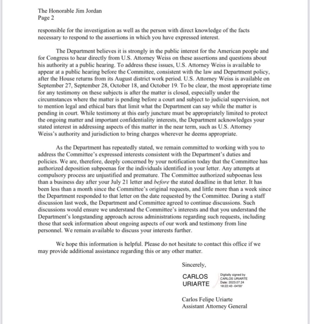 Or that the Request was from September of last year and Weiss has proven himself not fit. Also a lie when Representative Jim Jordan and Comer made such requests up to July of 2023.