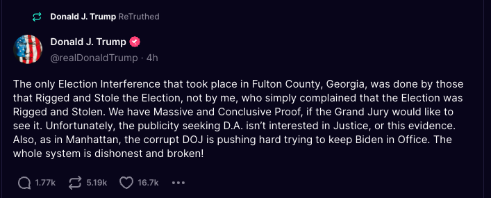 Trump has already ramped up his response. His campaign is airing a new ad in Atlanta making lewd (and false) allegations about Willis having an affair with a former client. He's called Willis "racist" and "phoney" Fani. He said today he has evidence for the grand jury