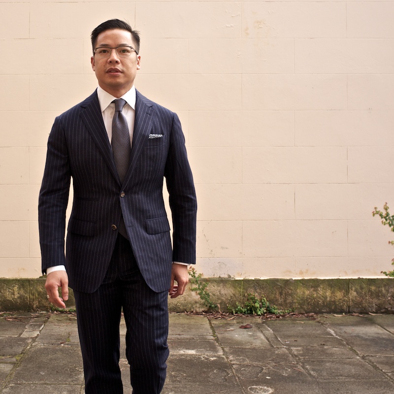 When you look at a beautifully made, tailored jacket, it has a certain 3D shape. Notice how the chest here is rounded. The sleeves have a conical shape that hovers around the arm. There are no wrinkles, dents, puckers, or pulling. This is a result of tailoring + pressing.