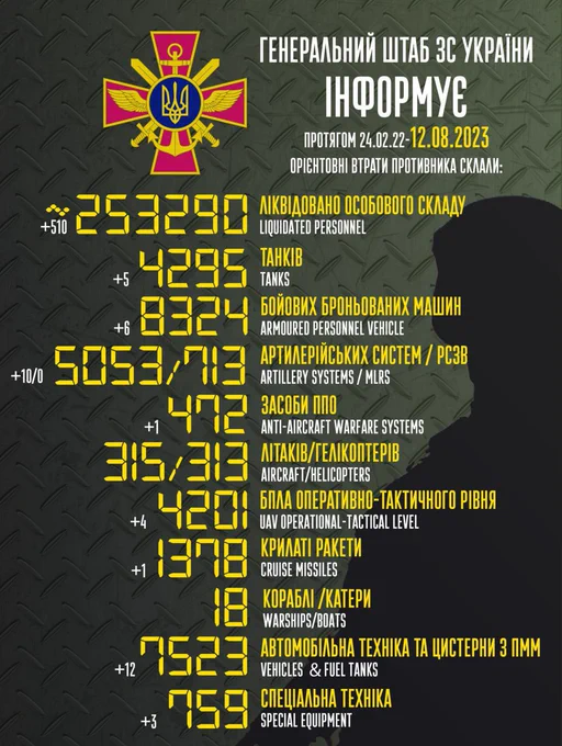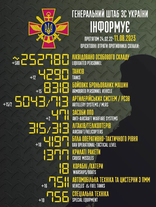 As usual we start with Russian losses per 08/08/2023 reported by the Ukrainian General Staff. We also include visually confirmed damage or destroyed Russian equipment or personnel.