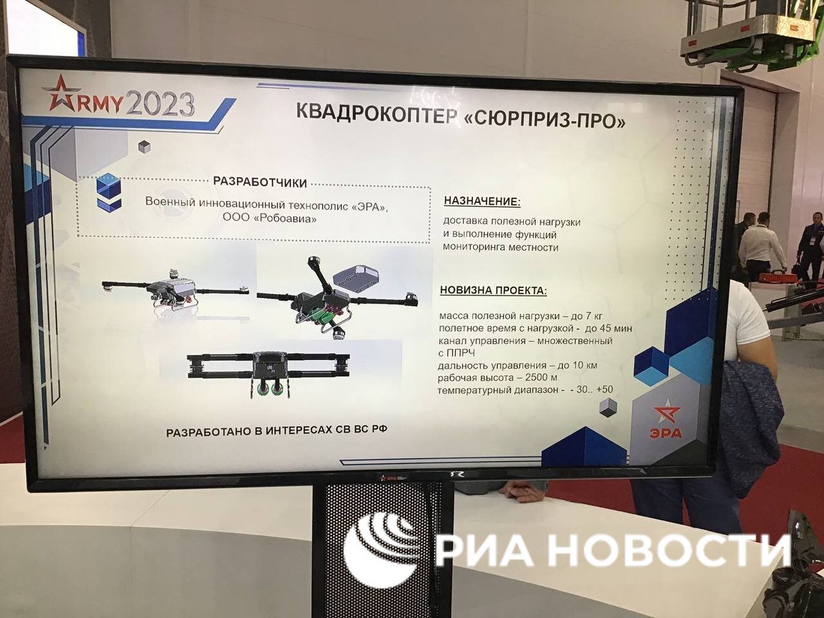 52/ A quadcopter named "Surprise", made of carbon and plastic, is presented at the #ARMY2023. It can apparently carry up to 7kg to a distance of up to 10km and carry two 82mm mines. It can also act as a kamikaze drone to a distance of up to 20km. t.me/rian_ru/212490
