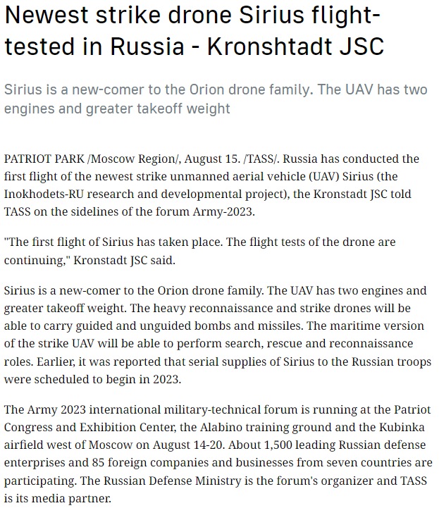 20/ Russia's Kronshtadt confirms at #ARMY2023 that it tested Sirius long-range UCAV earlier this year.