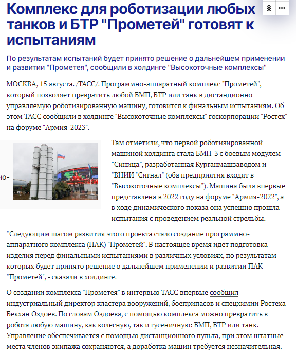 23/ Rostec announced that its Prometheus software and hardware system that can turn any infantry fighting vehicle, APC or a tank into a remotely controlled robotic vehicle is preparing for the final tests. The current emphasis is on increasing autonomy: "the combat vehicle will be able to move without the participation of the operator along the given coordinates with access to the required point, autonomously determine the best route, bypass obstacles, and quickly process information using technical vision."