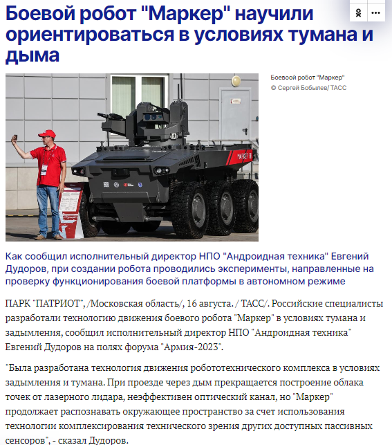 43/ Russia's "Android Technologies" claims to develop a technology for the Marker combat UGV autonomous movement in fog and smoke, when onboard LIDAR and optics may not be effective.
