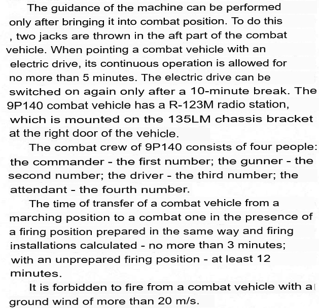 (16/25) This time assumes the vehicle is firing from a prepared position. If not, it can take much longer to get the 9P140 ready to fire.